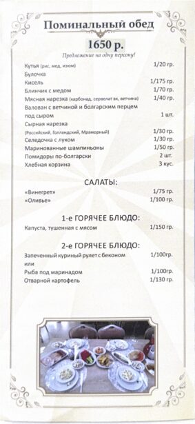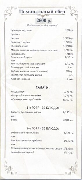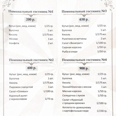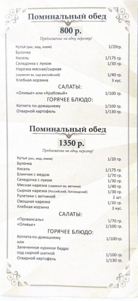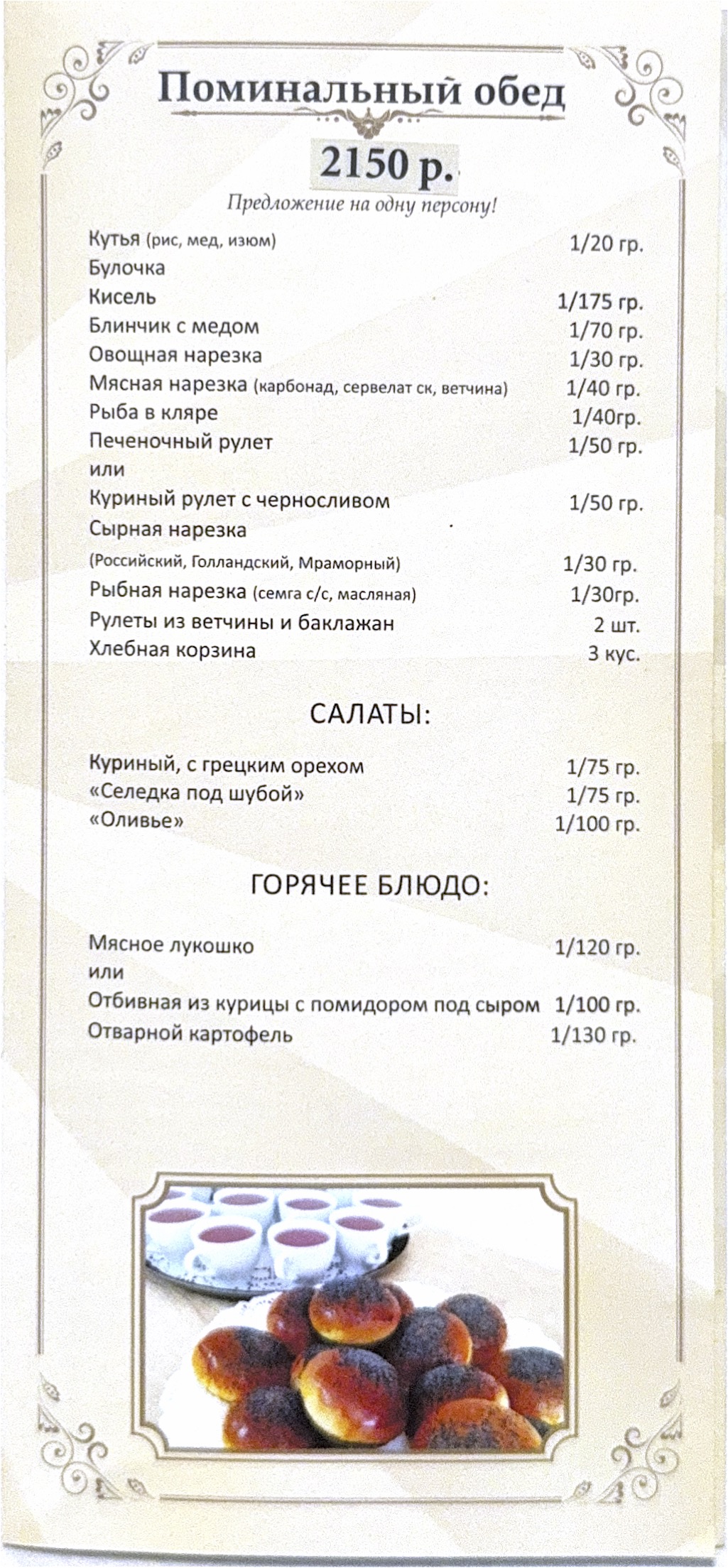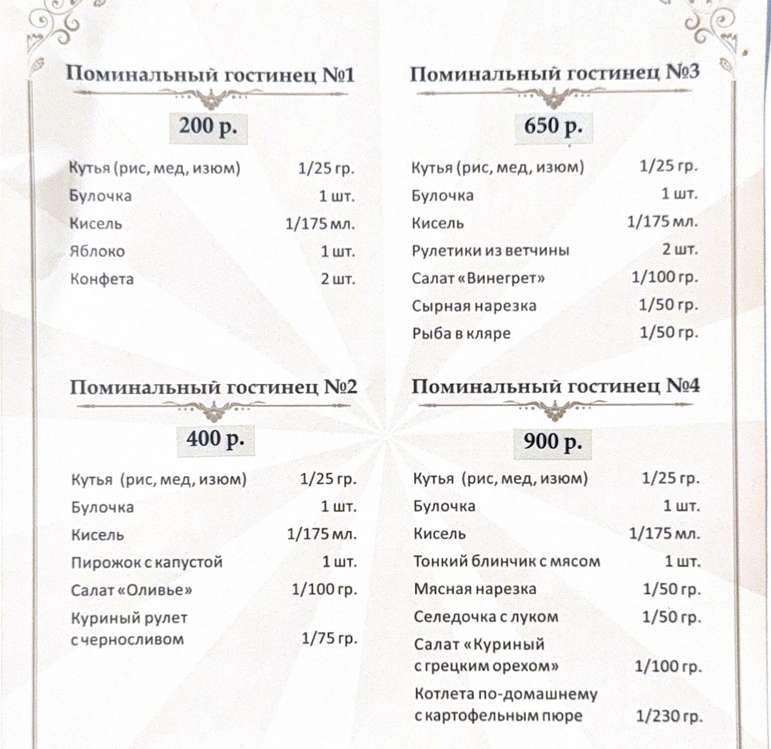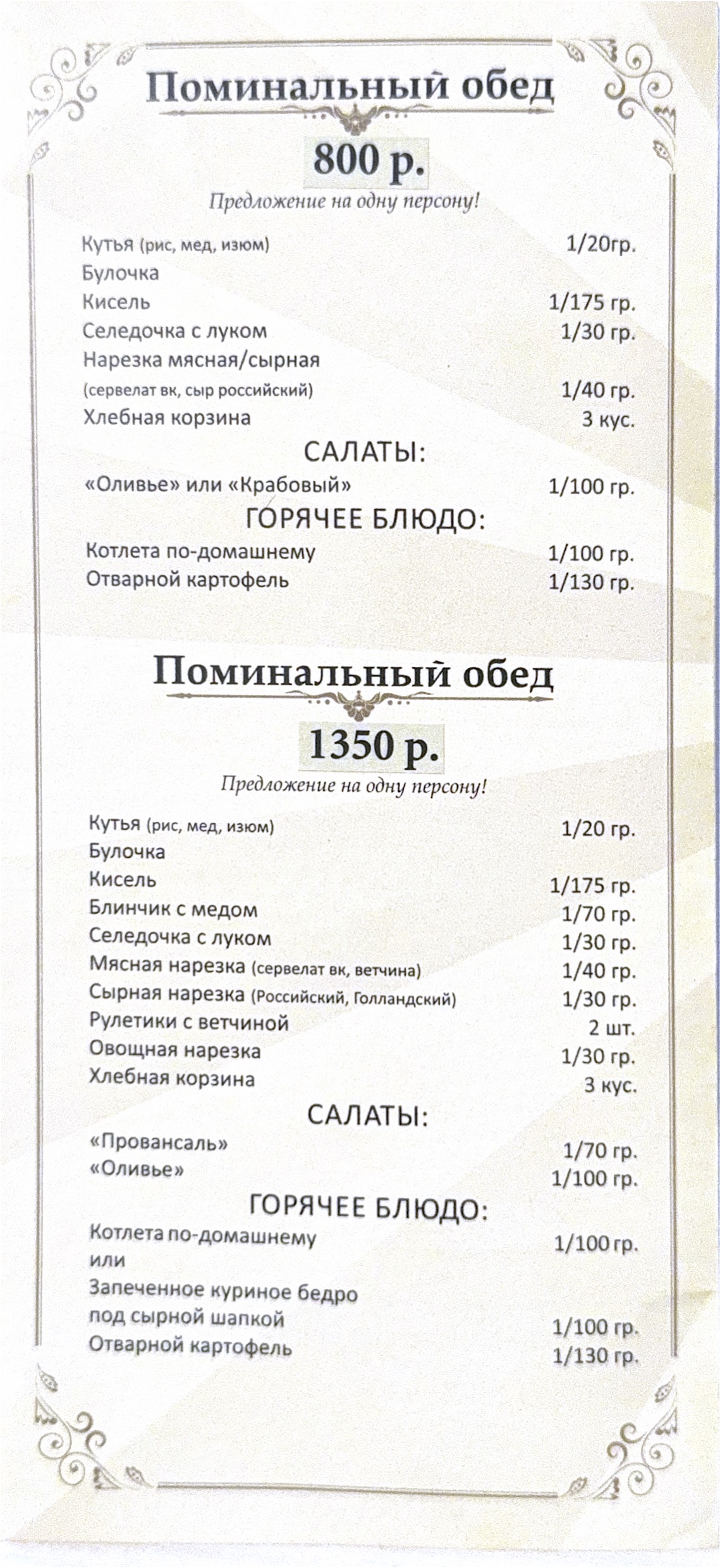 Кафе “Яркая Звезда” организует поминальные обеды в Калуге после похорон, а также на 9, 40 дней и 1 год с соблюдением всех традиций. Три зала: малый до 25 человек, средний от 35 до 40 человек и большой от 65 до 70 человек. У нас имеются различные варианты меню и Вы можете подобрать все индивидуально.